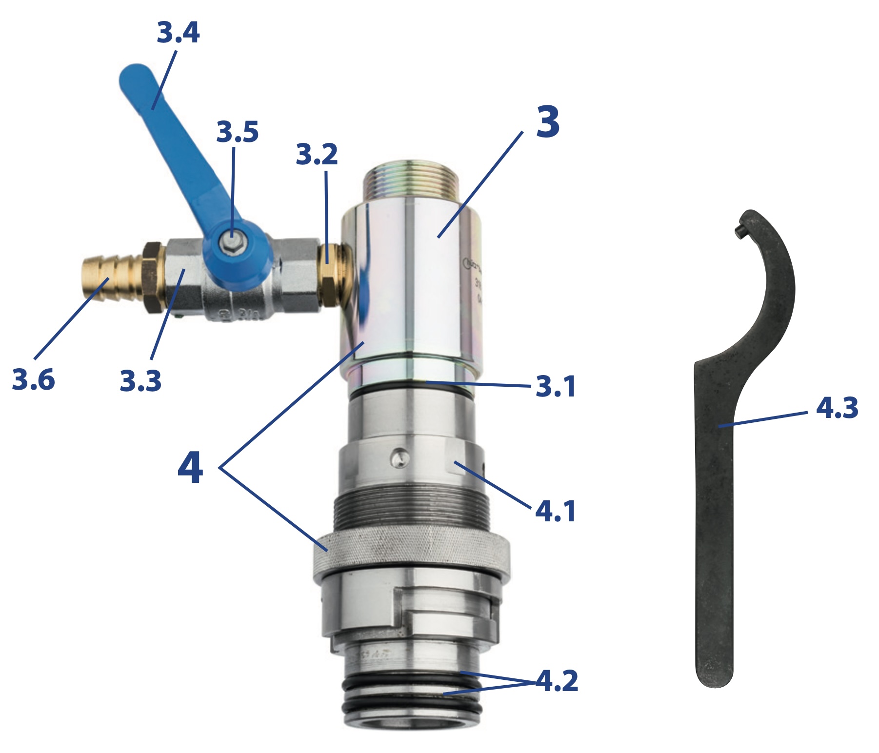 Anbohrgeräte Aufschraubstücke und Hilfsventile Düker Typ 1014-Anbohrarmatur Aufschraubstück mit Spülhahn für Düker Typ 1014-Anbohrarmatur Aufschraubstück mit Spülhahn für Düker Typ 1014-Anbohrarmatur Achtung!Bohrstange muss bei „TOP-Drehfix“ mindestens 600 mm lang sein (bei Perfekt 4 = 720 mm). TOP-Fix (mit Anschlussgewinde Rp 1½“) TOP-Drehfix (mit Bajonettverschluss) Hilfsventil nicht nötig Bild Beschreibung Best-Nr. Anzahl 3 Aufschraubstück G 1½“ - Rechtsgew., mit Spülhahn,für Düker Typ 1014 TOP-Fix,Bohrungs-Ø max. 38 mm 316 316 4 Aufschraubstück komplett (Bajonett-Verbindung),mit Spülhahn, für Düker Typ 1014 TOP-Drehfix,Bohrungs-Ø max. 38 mm 316 720 Auswahl zur Anfrage übernehmen Anfrageliste anzeigen → Ersatzteile Bild Beschreibung Best-Nr. Anzahl 3.1 O-Ring bis 80 °C 360 804 3.2 Doppelnippel G ¾ 370 231 3.3 Kugelhahn Rp. ¾ I.I. 370 230 3.4 Handhebel 370 504 3.5 Schraube für Handhebel 370 505 3.6 Schlauchtülle 316 318 4.1 Anbohradapter-TOP-Drehfix, lose 316 700 4.2 O-Ring Ø 47 x 4, bis 80 °C (2x erforderlich) 360 809 4.3 Hakenschlüssel 58-62, mit Zapfen 260 165 Auswahl zur Anfrage übernehmen Anfrageliste anzeigen → Auswahl wurde übernommen.